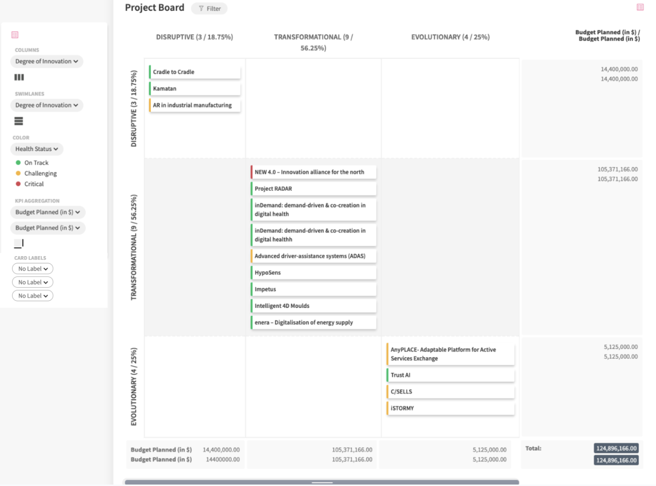 The ITONICS Board visually represents an information landscape that follows a particular process flow. By using columns the process flow can be represented from the start point over different stages to a final stage. On top, financial KPIs can be aggregated, coming from each content element listed on the board.