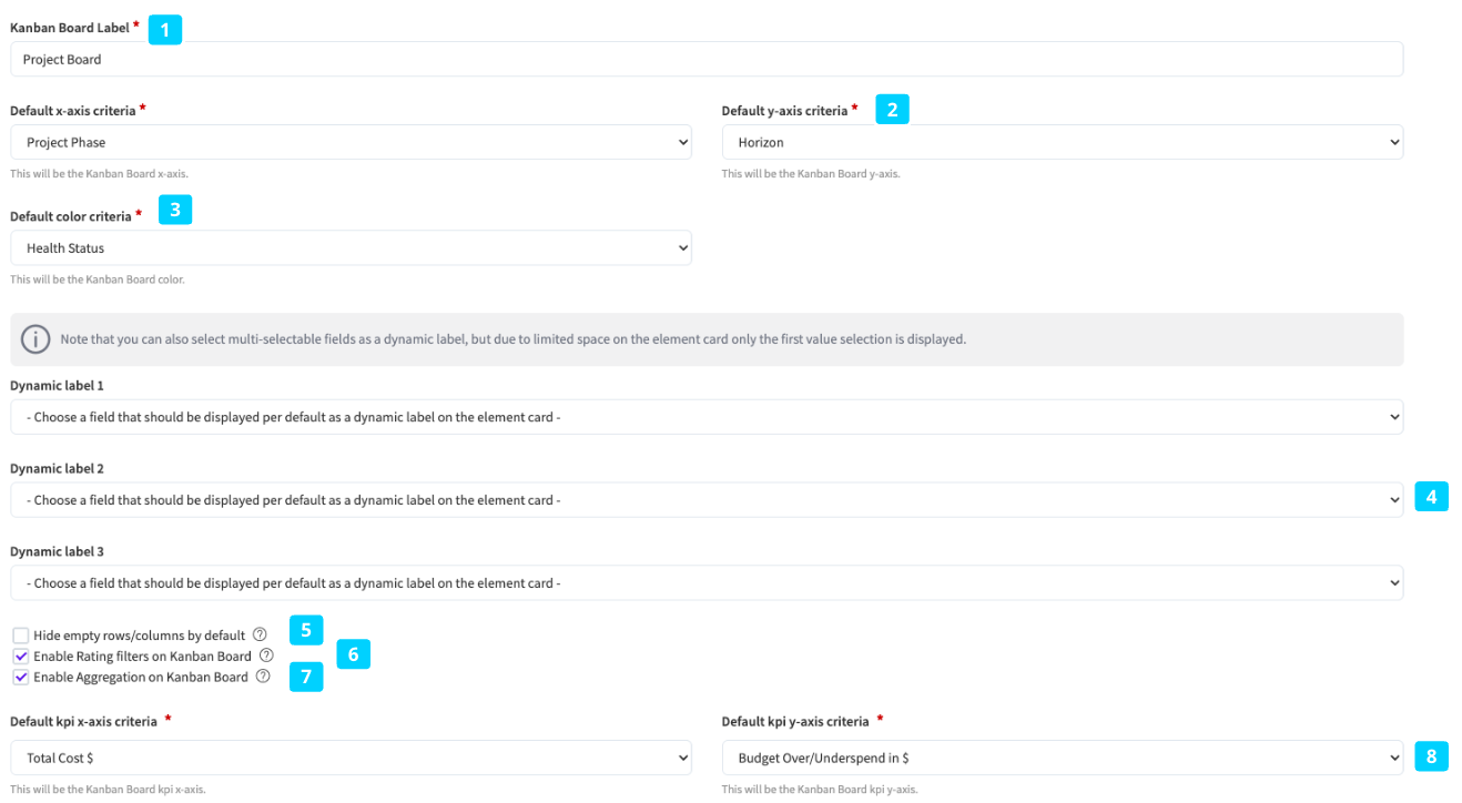 Configure if empty rows and columns shall be hidden by default when opening the board visualization (note that if the option is enabled in the Board visualization, it is expected that the column width is calculated dynamically to maximize space for visible columns). (5)
