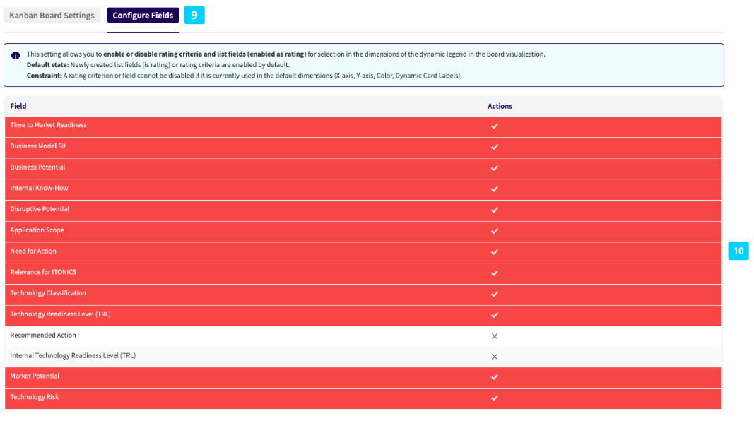 Via the Configure Fields sub-tab, you can specify the fields that should appear for the information dimensions (x-axis, y-axis, color) (9). This configuration allows you to enable/disable criteria/fields to ensure that only rating criteria and list fields relevant to the actual analysis of the visualization are outlined on the dropdowns to not overwhelm users with an unnecessarily long list of rating criteria/fields (10). Note that fields that are used as default for the dimensions cannot be disabled.