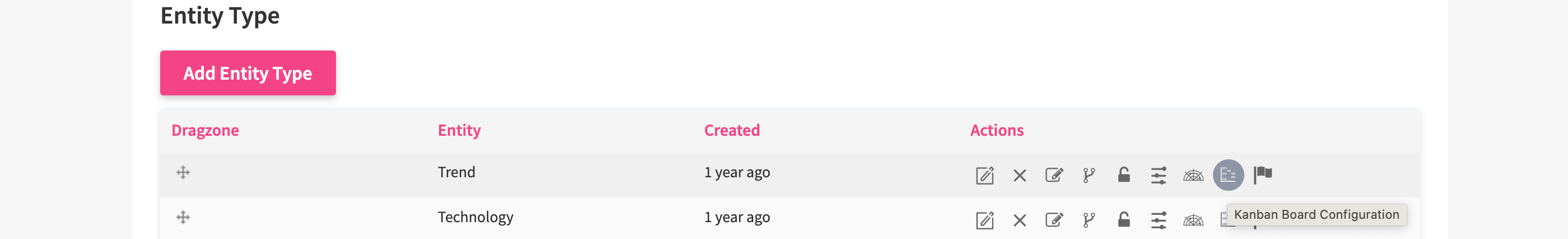 After you enabled the Kanban Board for the specific entity, you can now start with the Board configuration. To configure the Kanban Board for a certain entity, choose an entity and click on the Kanban Board icon.