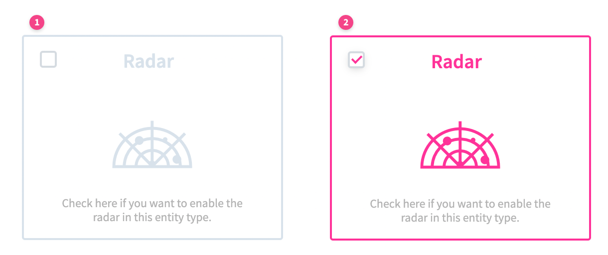 While your users will later have the option to customize the radar to their needs, you need to provide them with a default configuration. Radars can be built on top of each entity. This also means that content displayed on the radar will be always of the same entity type.