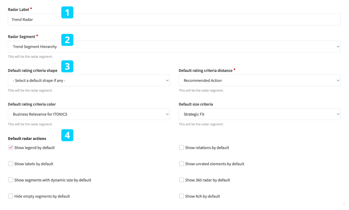 - Define the Radar Label - the title that is shown on the top left side of the Radar. It can be anything you want to name your Radar, and you can use 256 characters maximum. (1)
