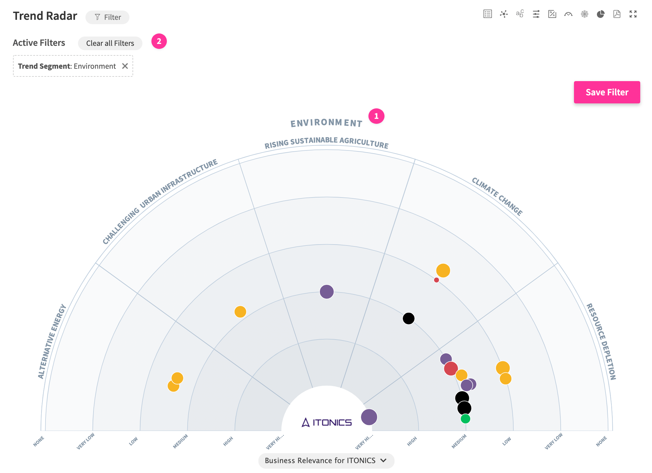 - One-click radar adjustments: The ITONICS Radar offers a dynamic legend and various filter options that allow you to change the radar layout within seconds and as you (or any user) need it. It allows you to intuitively handle large amounts of data by using filters and zoom functions.