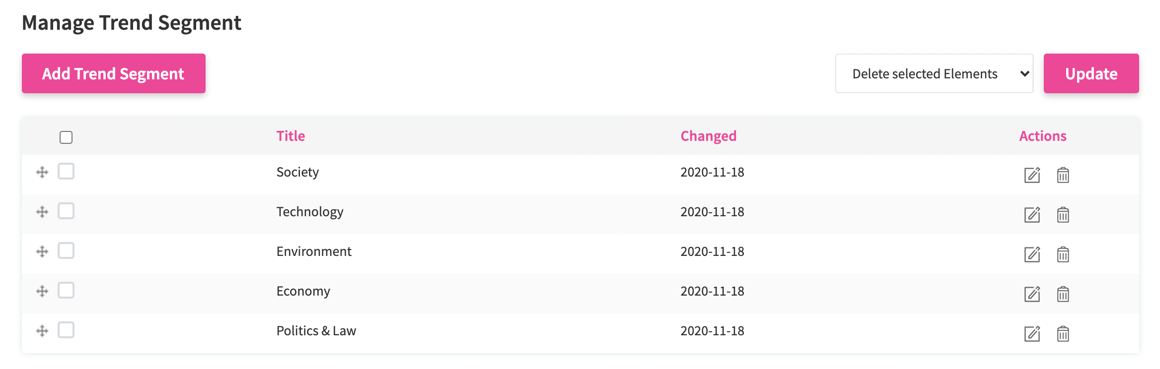 - Delete a few elements at the same time by selecting the checkboxes on the left side of the elements and clicking Update next to the Delete selected elements drop-down menu.