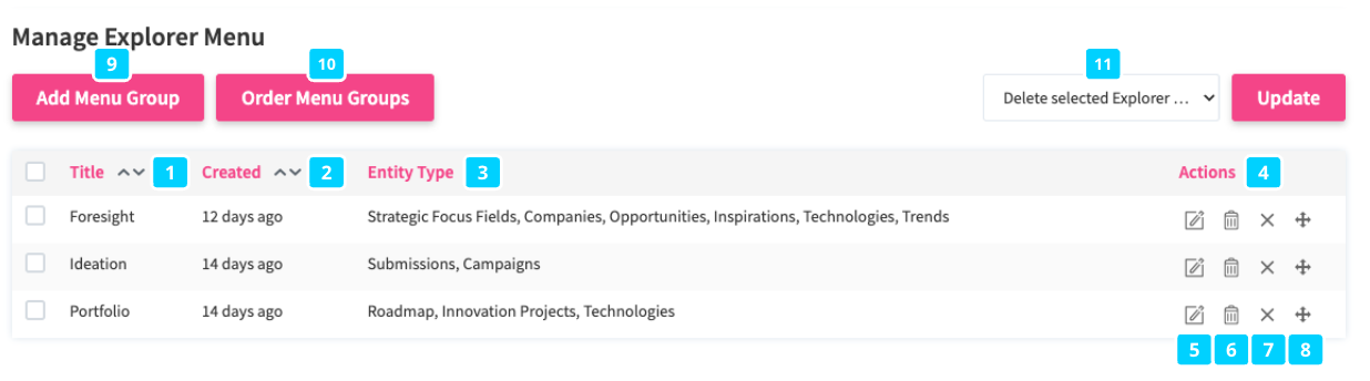 Here, a table overview of all currently configured Explorer menu groups is displayed, showing the title (1), creation date (2), and the entity types comprising the individual group (3). On the right side, the typical Actions panel (4) gives access to different quick actions, such as editing an existing Explorer group item (5), deleting a particular group (6), only disabling a particular group (7), or configuring the order of the entity types comprising a group (8). Note that groups may also be deleted in bulk if selected and confirmed via Update (11). Click Order Menu Groups to define the order of all existing menu groups in the Explorer dropdown (10).