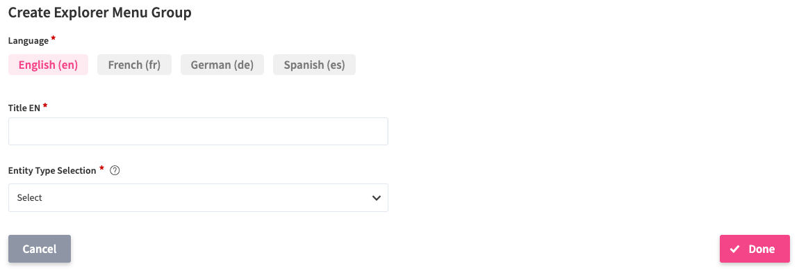 To create a new menu group, click the Add Menu Group button (9), which will direct you to the Create Explorer Menu Group page. Here, a Title must be provided per enabled system language, since dependent on a user’s language preference, the group label translation will be displayed. Secondly, the entity types pertaining to a group must be selected (at least one entity type). All entity types, incl. Campaign Submissions and Roadmaps are listed (if the modules are enabled).