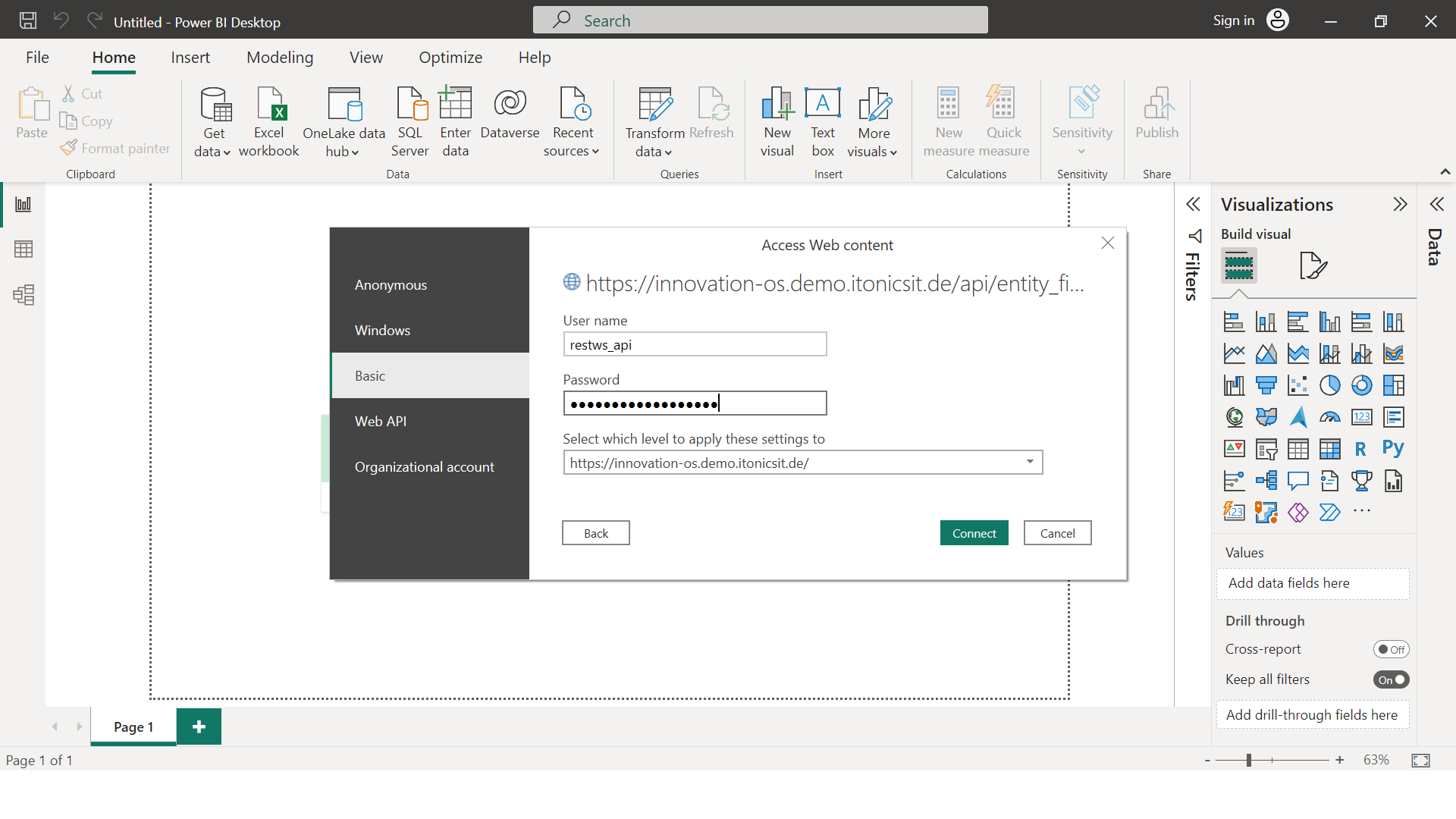 When you have entered all the data, either press the "Enter" key or select "Connect". The query will now be executed and PowerBI will request the information from your ITONICS application.