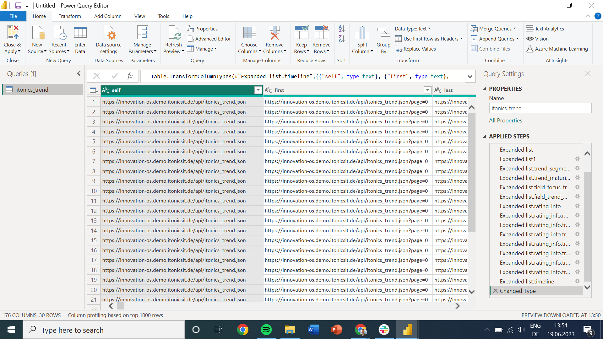After the query has been successfully executed, PowerBI automatically opens a new "Power Query Editor" window containing the requested data. PowerBI automatically creates a table view from the .json format sent by your ITONICS application.