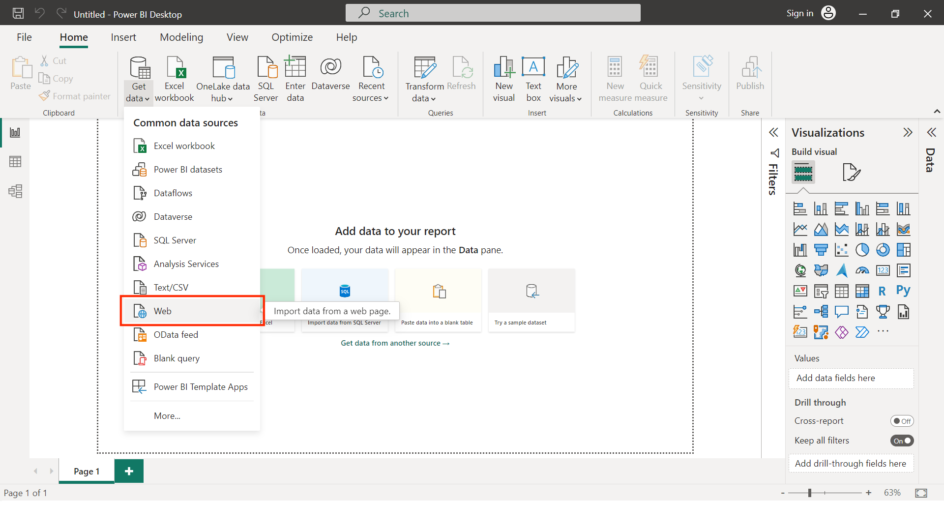 First of all, you have to define the method you want to use to import the data into PowerBI. To pull data from the REST API you have to use the "Web" method, which you can access the dropdown for the "Retrieve Data" option.