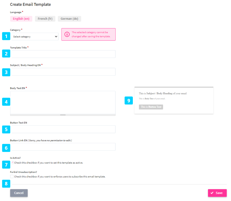 - Enforce the subscription of a specific email template using the Forbid Unsubscription option (8).