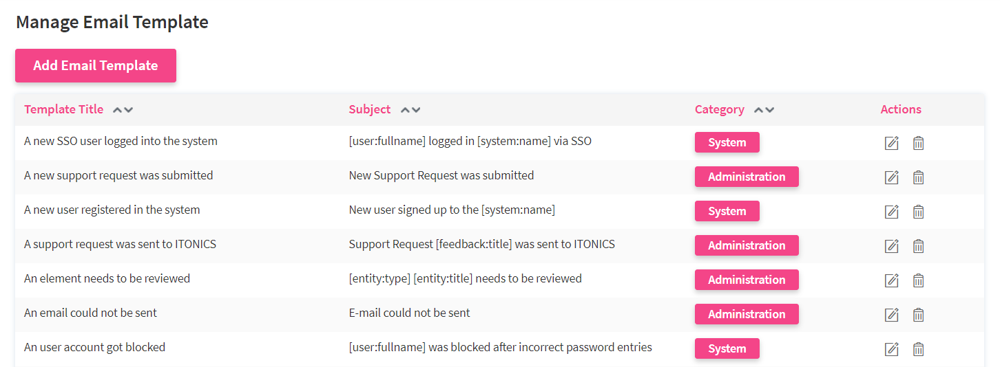 ITONICS allows you to edit existing email notifications or add new email templates. Adding new email templates is particularly powerful when using the workflow configuration , the external gateway , or setting up date picker reminder .
