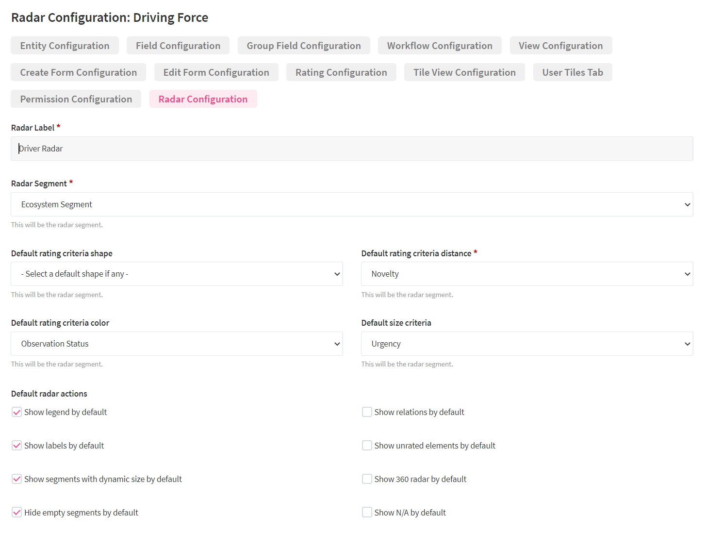 In the tab, you will be requested to give a more specific name to your radar. Particularly for the radar, you are also requested to assign segment fields. In the configuration options below, you will be able to define the default look of this module. You can use your attributes and rating criteria defined and express their meaning by the different visual indicators, e.g., the distance to the radar center, the shape, the color, and the size.