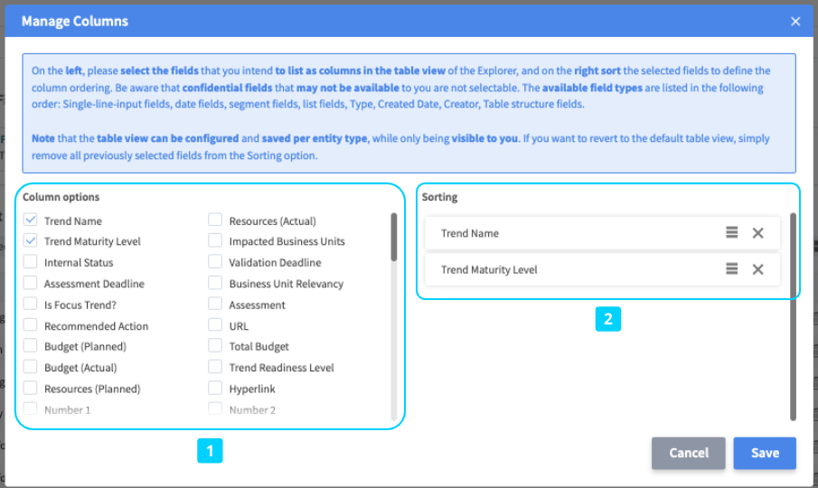 On the left, the user can select from the fields available to her/him (note that any confidential fields not available to the user will not be listed) to define which columns the table view for the particular entity type shall have via the Column options section (1). Once selected, the fields become available on the right side within the Sorting section (2) to define the ordering of the table view.