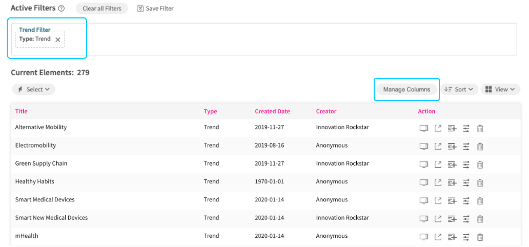 Now, if a single entity type is selected via the filter options and the Table View option is selected, the Manage Columns option becomes available. Clicking on the action button will open the Manage Columns option that allows to configure a tailored list view for the respective entity type in the Explorer. Note that this list view can be configured per entity type, while only applying to the particular logged-in user and remaining active until changed otherwise, meaning the list view for the respective entity type is not reverted on page reload or re-login, but remains as is until changed.