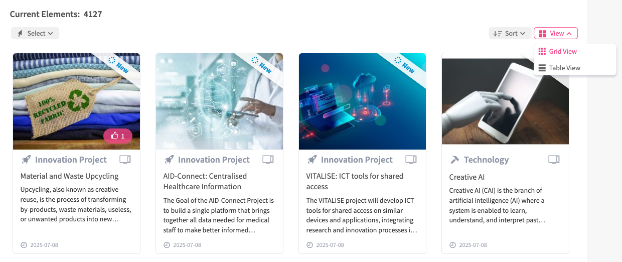 To change the layout of how content is displayed, you can choose between two options. You can either display the content in a list view (table view) or display the content by cards (grid view). To adjust the layout, go to the View drop-down and select your preferred view. Please note that the display option chosen will stay until it is reset again.