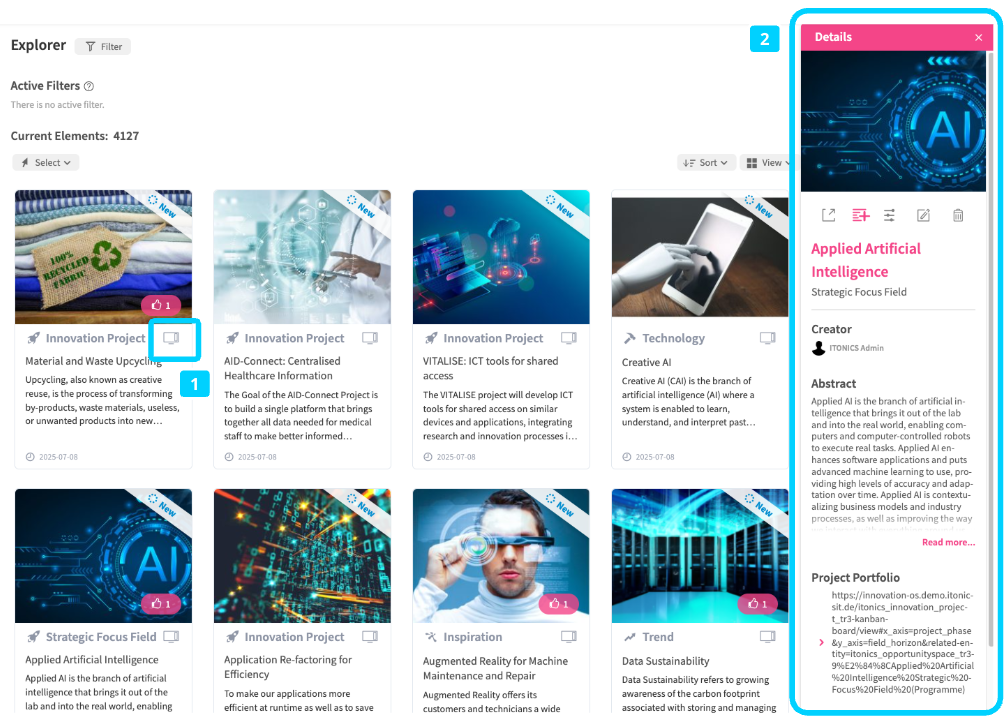 If you want to have a quick view of an element in the Explorer, hover over the selected element card and click the Preview icon, left to the general content category (1). The element preview will pop up at the right side of the screen and will show its relations if you scroll down on the sideview (2).