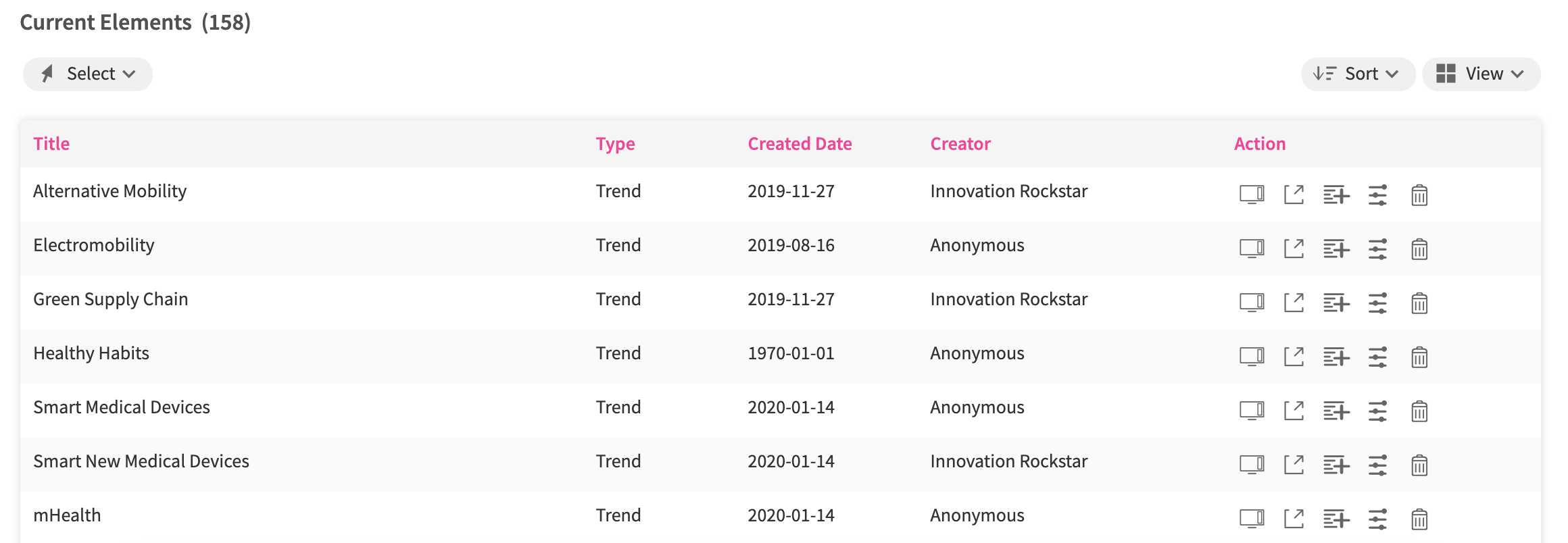 The Explorer is the heart of the ITONICS application. In the Explorer, you can find all the content that exists throughout the system. This includes published content as well as content that is archived, in draft mode, or under review. It thus serves as the easiest way to find content around specific topics (cf. the article on searching content) or filter criteria.