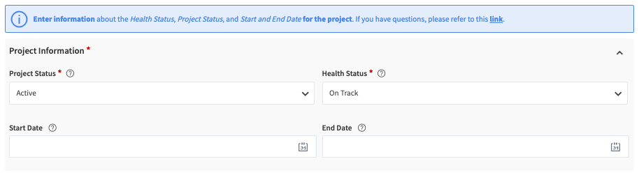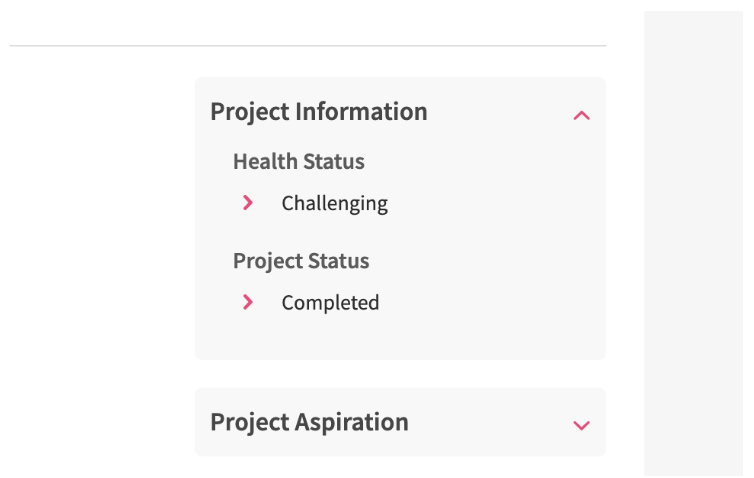 - When you select the Default Expand checkbox, the information will be expanded in the default view. In the example below, Project Information is presented with an expanded view, while Project Aspiration is an example of information presented in a compressed view.