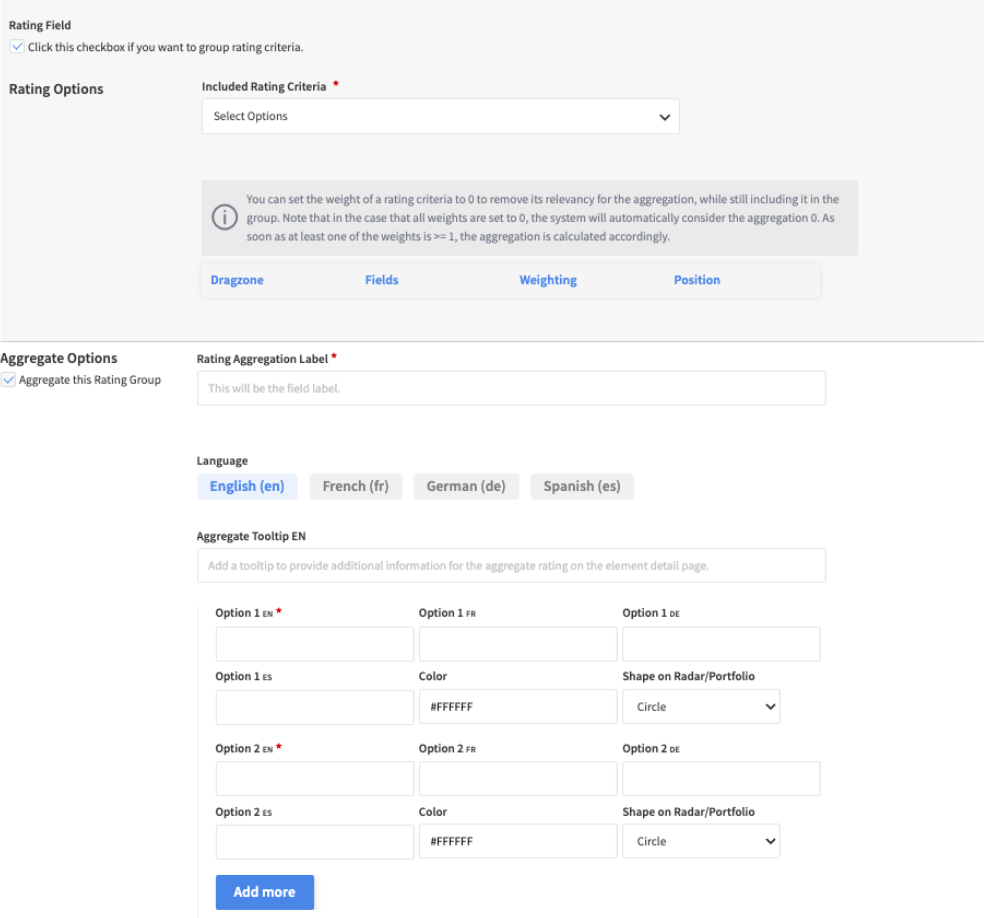 This grouping of ratings also provides you with the possibility to build an aggregation across all the values of the rating criteria. To build an aggregated rating, check the box "Aggregate this Rating Group". You can now assign a name for this aggregated rating and weights for each rating criterion in the group.