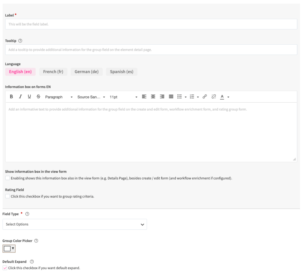 - Define a highlight color for the group field to be displayed on the element detail page via the Group color Picker.
