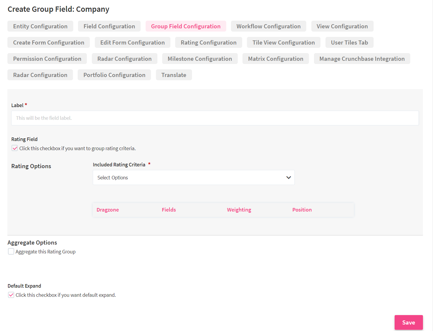 You can add a new group field by clicking on the Add Group Field (6) button. When creating a group field, you are presented with three attributes: Label, Field Type, and Default Expand.