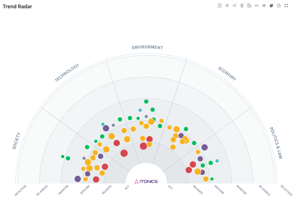 The ITONICS Radar allows displaying a rich content landscape and understand it easily by representing multiple characteristics simultaneously by the distance to the radar center, placement in a segment, color, size, and shape. Now, to easily communicate your foresight activities or innovation initiatives via a public website or intranet, you can make use of the radar embed. This way, you can embed the radar as an iframe to keep your workforce up-to-date, inspire an external audience, or find partners to collectively work with on innovation initiatives in the future.
