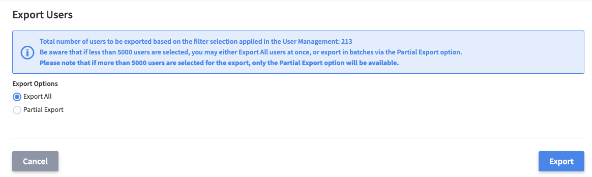 - A new window will open automatically. Here, you can choose whether to Export All users at once, or perform a Partial Export in batches.