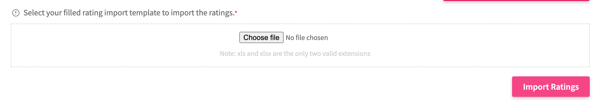 When ready, Save the Excel file, Click the Choose file button, Select the Excel file and Upload it to the platform by clicking the Import Ratings button.