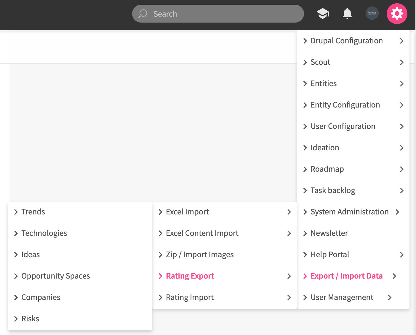 Navigate to Settings > Export / Import Data > Rating Export and Select an Element type. After you select an Element type, the download with all Ratings for the Elements per user will be started automatically. The rating results within the exported file are presented and split based on the user context and users performing the rate action, while they are not split based on the rating groups configured. Note that the “Rated At” column will display the latest date when ratings are provided by the same user on different dates in the same context, meaning the latest excerpt and status of the ratings is included in the rating export. As the assigned user contexts such as business unit of the user are included in the export, this allows for further analysis of the ratings outside the ITONICS system.