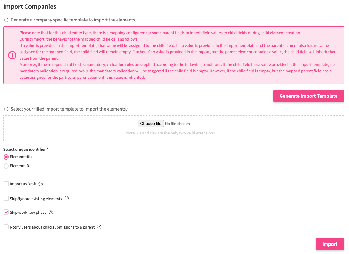 Besides, when importing elements for a child entity type, the option to notify users about child submissions to a parent will be available. If checked, the system will notify users assigned in any user search- or user group search fields on the respective parent entity type, for which the option to notify users about child element submissions is enabled, about child elements newly imported via the Excel import to a particular parent element. If unchecked, imported child elements will not trigger a notification to responsible users on the respective parent elements.