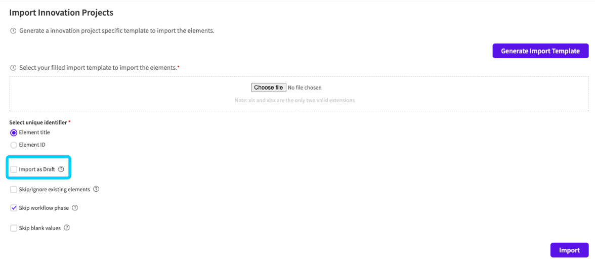 - Import as Draft: Only new Elements will be imported as drafts, while existing Elements will not be affected by this option.
