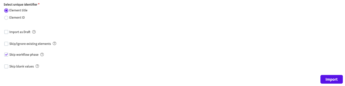 - Skip workflow phase: The first workflow phase will be allocated to the imported Elements. If the box remains unchecked each Element will be allocated to the defined workflow phase.