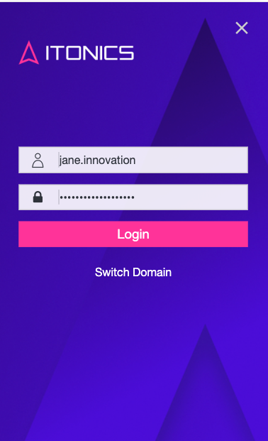 Enter the same user credentials as you would use to enter the ITONICS application, i.e., your username (in this example, firstname.lastname) and password. Click Login.