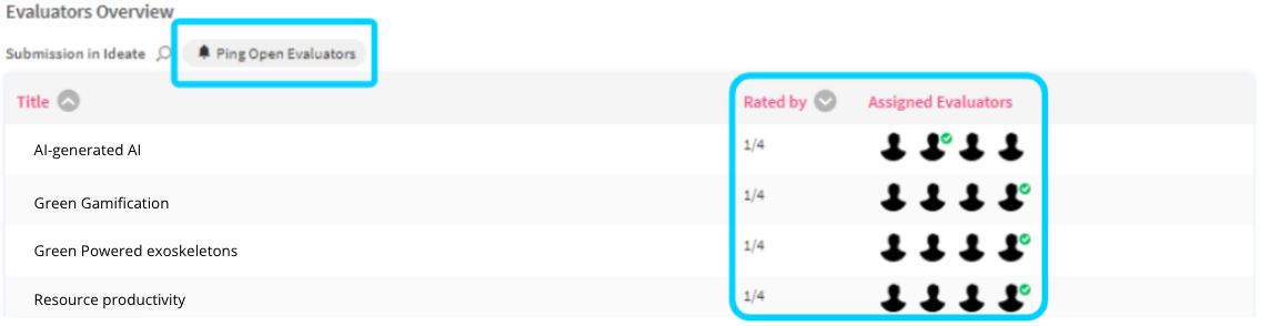 We have added a new evaluators overview to the campaign dashboard. This new feature enables the campaign manager to easily track the progress of different ratings tasks of assigned evaluators for submissions within a campaign, and ping evaluators with pending rating tasks.