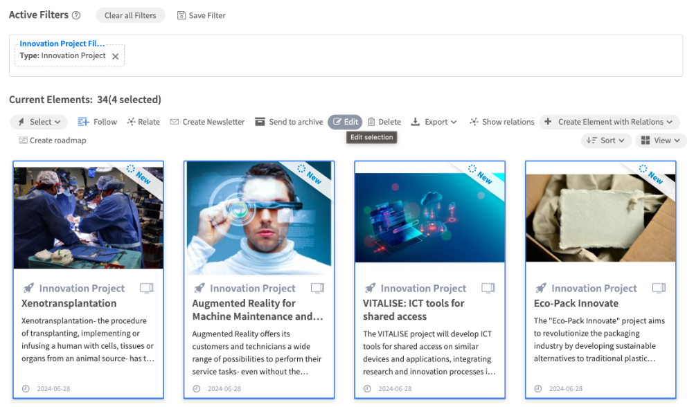 We have implemented a new bulk edit functionality in the Explorer to facilitate adjusting values of specific field types across elements of a particular entity type in bulk. For example, comfortably update the health status of multiple Innovation Projects at once.