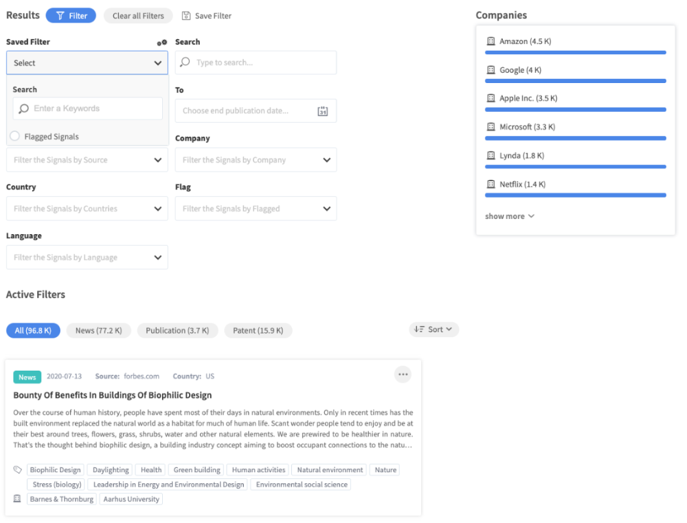 We have improved the capabilities within the Signals Feed by making use of the global saved filters functionality. Save filter settings for the Signals feed per element, either for your own private use, publicly or with a selected user group to allow other users to easily apply the same filter selection to comfortably achieve a common view on relevant signals.