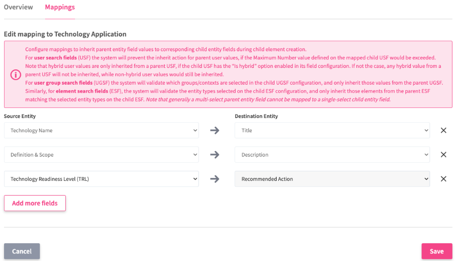 We have introduced a new functionality that enables automatic inheritance of field values from a parent element to a child element. This enhancement streamlines the management of parent campaigns and child idea intake, ensuring seamless alignment across parent-child workflows. For example, a responsible user assigned to a parent element can now be automatically inherited during child element creation, reducing manual effort and improving consistency.