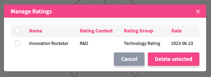 Within the Rating Analysis tab, the application owner or user with the appropriate permission has the ability to analyze, filter, or delete the individual ratings that have been submitted for an element.