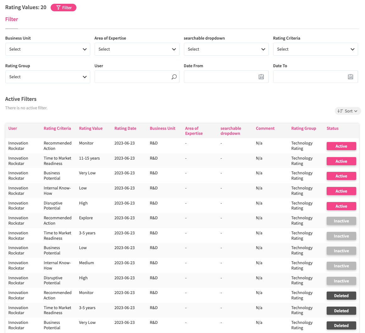 The Status of a rating can be Active (the most recent rating of a user), Inactive (a previous rating of a user that was updated by him/herself and is now invalid) or Deleted (the rating was deleted via the Manage Ratings menu, or the underlying rating criteria has been disabled).