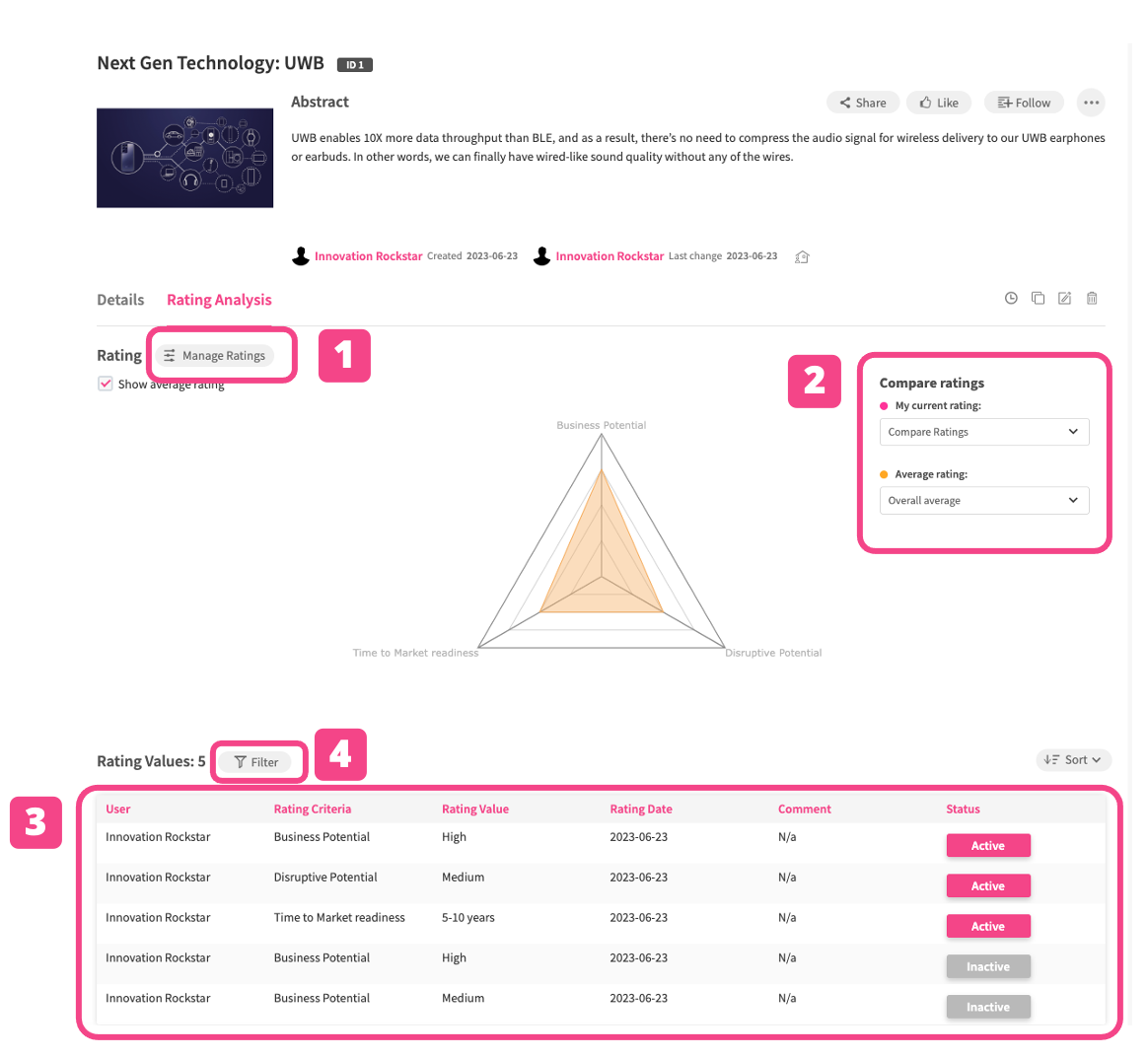At the bottom of the tab you will find an overview of all Rating Values (3). The overview provides information on the User name, Rating Criteria and Value, Date and Status of the rating and whether a rating has been commented on.