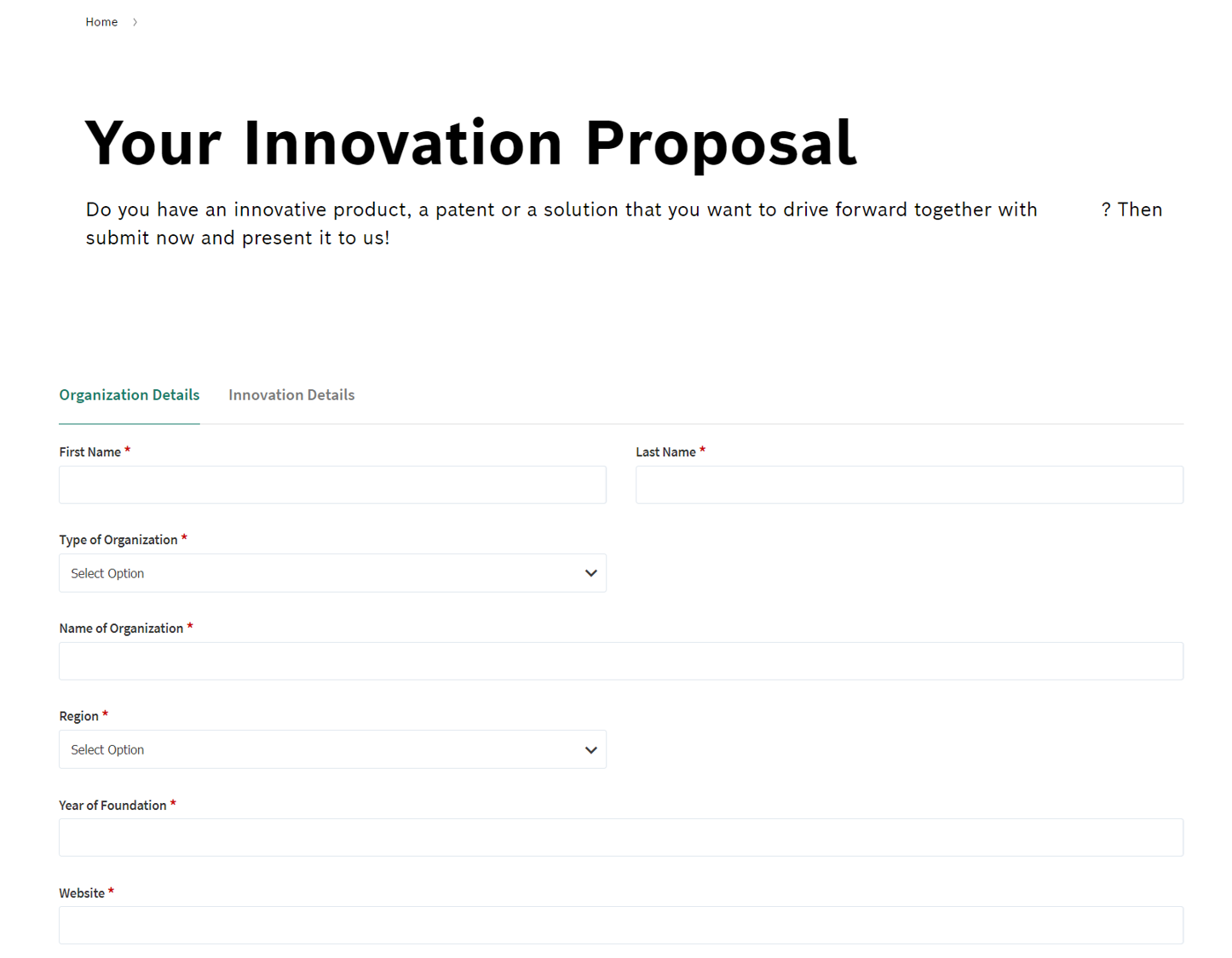 - Organization Type (Dropdown with the following values: Start-Up, Incumbent, Scientific, Other)