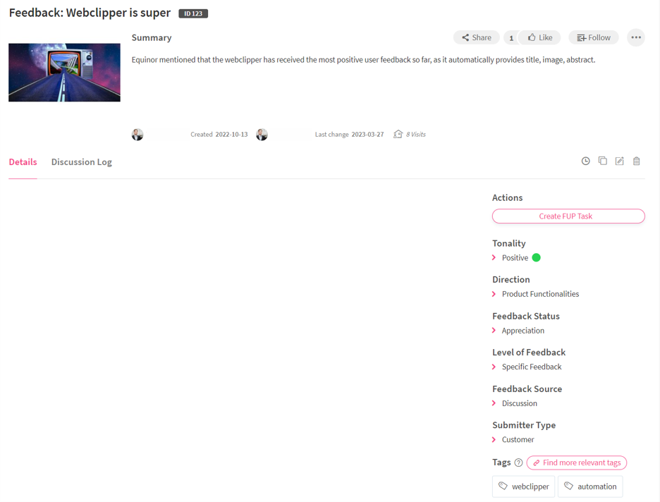 To make your feedback collection process really powerful, you should advise the submitters to add tags to categorize the incoming feedback specifically. Tags are keywords that can be added without any restrictions by everyone with the right to create or edit content. The tagging is not restricted to a list of options but can be added individually. They are, thus, different from a dropdown categorization with pre-defined values from which you can pick and choose. Tags allow the addition of a specific categorization. Ideally, this enables you to identify new patterns.