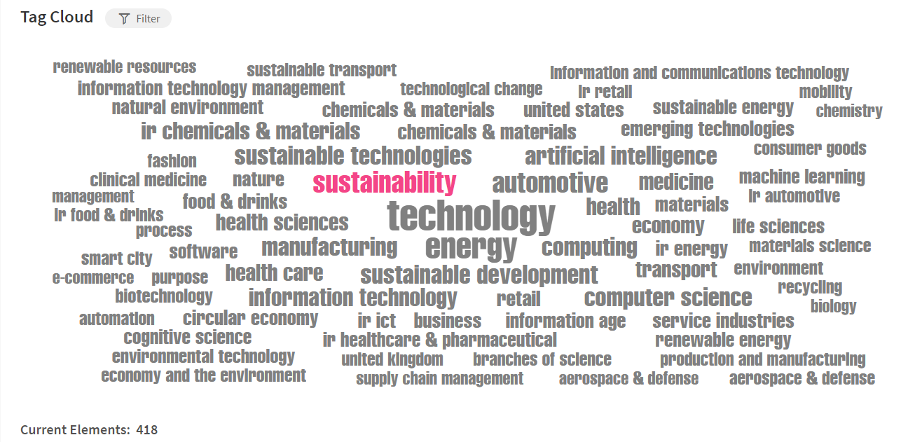 After the collection, it is required to muddle through all the incoming signals and unravel the insights that emerge across the variety of signals. With the ITONICS Tag Cloud, you have the right tool at hand to identify such patterns and identify new drivers/trends which you can act upon as a first-mover.
