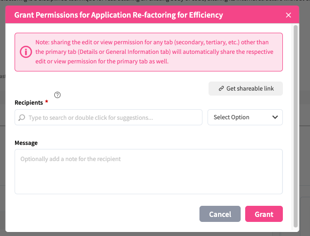 Revoke Access: You can see a history of granted permissions and remove them at any time. Note: Revoking "View" access will automatically revoke all higher permissions (Edit, Delete, Rate) granted through this tool.