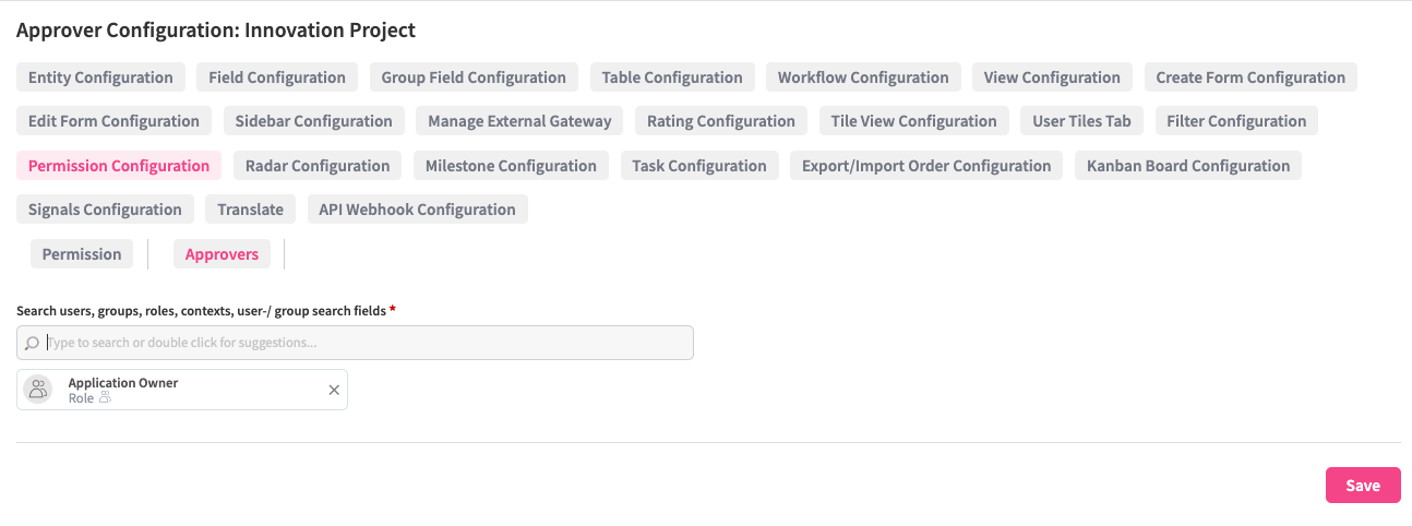 Personas: You can select specific users, roles, user groups, contexts, entity-specific user search-/user group search fields, or even the Creator persona to be Approvers for all permission requests for elements of the associated entity type.