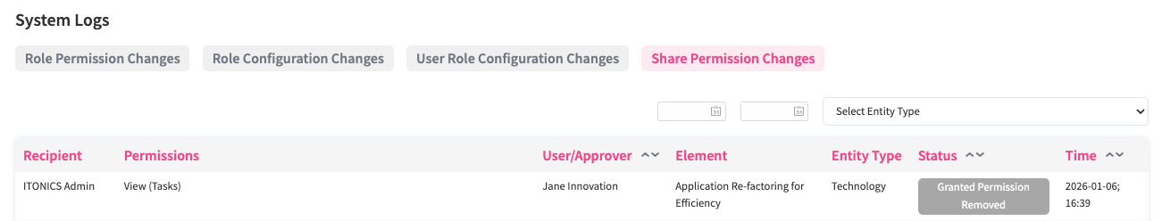 To ensure security and transparency, every change made via the Grant/Request Permission feature is logged. Administrators can view these records by navigating to: Settings > Logs > System Logs > Share Permission Changes.