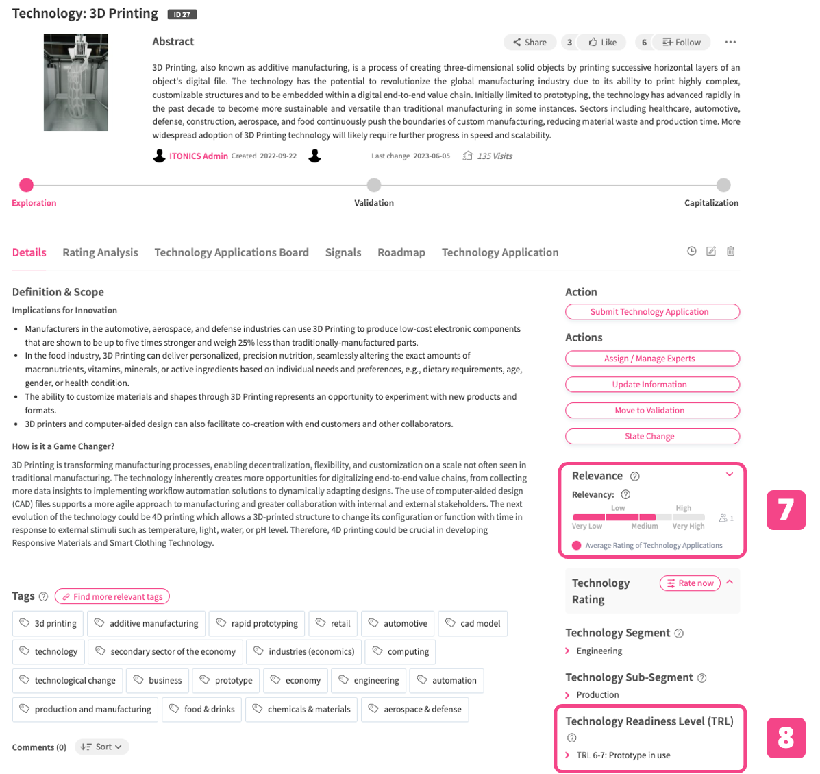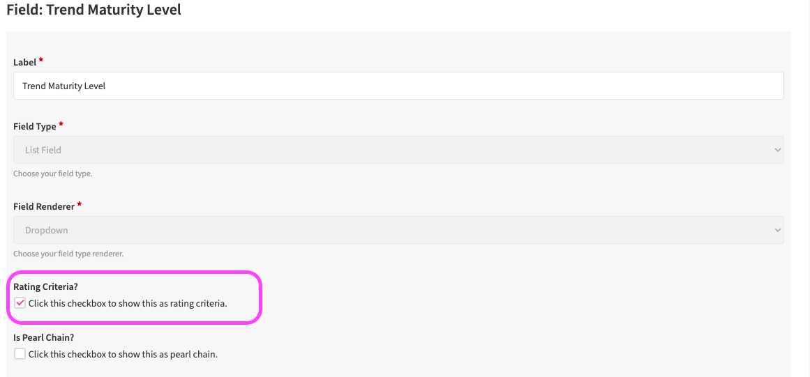 The criteria (e.g. market potential or complexity as ratings or technology readiness level as categorization) and their attributes (e.g. high, medium and low) must be defined via the Rating Configuration if you want to use ratings or list fields/dropdown fields if you want to use categorizations which are indicated as rating criteria, activated and assigned beforehand.