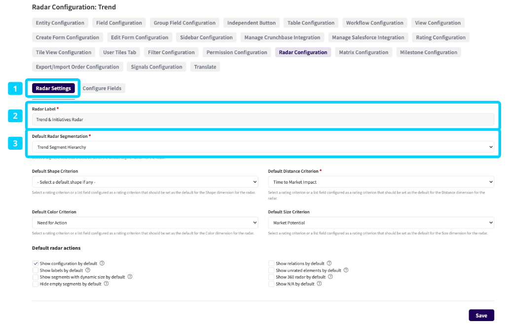 After enabling the module, you can configure the default view according to your preferences. There are two ways to access the Radar Configuration tab: