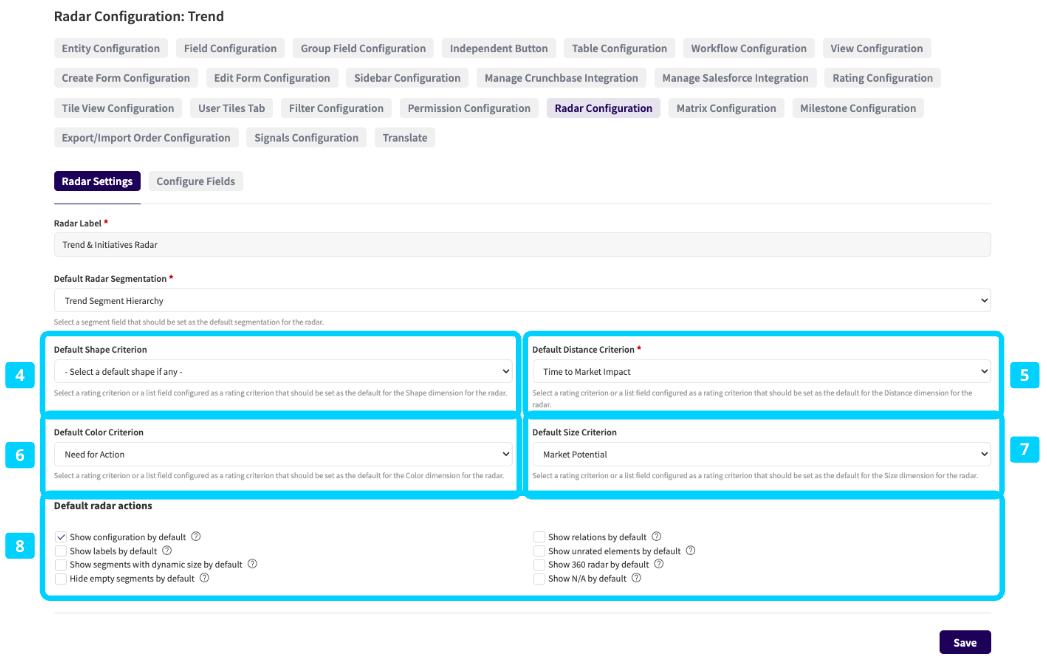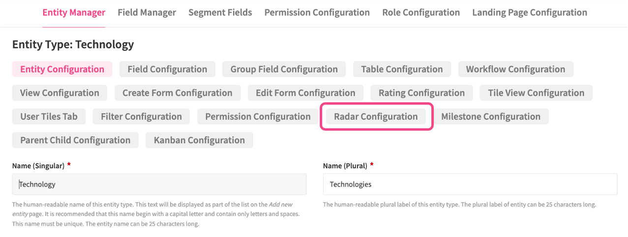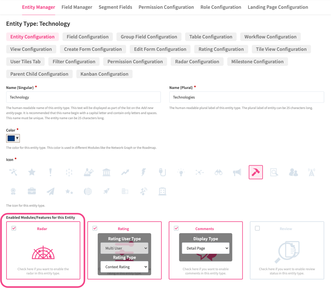 While your users will later have the option to customize the radar to their needs, you need to provide them with a default configuration. Radars can be activated on any entity but only one radar can be used per entity e.g. Trend radar for Trend entity or Technology radar for Technology entity. This means that the content displayed on the radar always corresponds to the respective entity type.