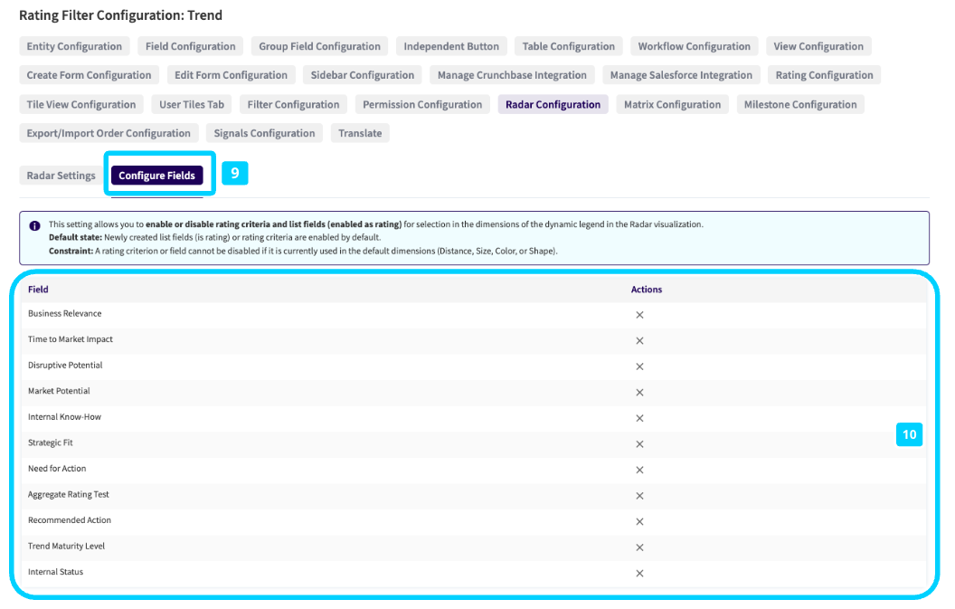 Furthermore, you can specify the fields that should appear for the information dimensions (distance, size, color, shape) under the Configure Fields sub-tab (9). This configuration allows you to enable/disable criteria/fields to ensure that only rating criteria and list fields relevant to the actual analysis of the visualization are outlined on the dropdowns to not overwhelm users with an unnecessarily long list of rating criteria/fields (10). Note that fields that are used as default for the dimensions cannot be disabled.
